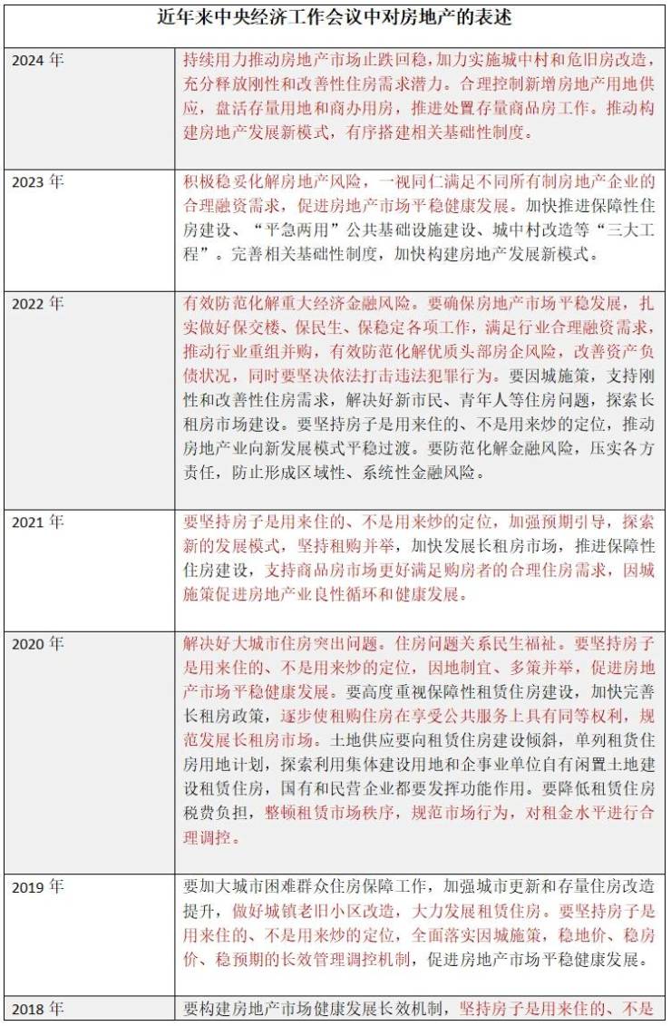 对于明年房地产市场的定调,会议提出,持续用力推动房地产市场止跌回稳,加力实施城中村和危旧房改造,充分释放刚性和改善性住房需求潜力。合理控制新增房地产用地供应,盘活存量用地和商办用房,推进处置存量商品房工作。推动构建房地产发展新模式,有序搭建相关基础性制度。