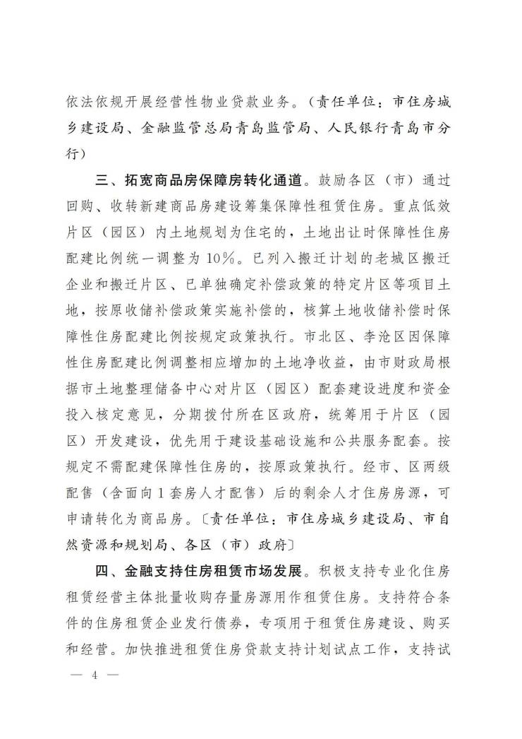 鼓励各区 (市)通过回购、收转新建商品房建设筹集保障性租赁住房。重点低效片区 (园区)内土地规划为住宅的,土地出让时保障性住房配建比例统一调整为10%。已列入搬迁计划的老城区搬迁企业和搬迁片区、已单独确定补偿政策的特定片区等项目土地,按原收储补偿政策实施补偿的,核算土地收储补偿时保障性住房配建比例按规定政策执行。市北区、李沧区因保障性住房配建比例调整相应增加的土地净收益,由市财政局根据市土地整理储备中心对片区 (园区)配套建设进度和资金投入核定意见,分期拨付所在区政府,统筹用于片区 (园区)开发建设,优先用于建设基础设施和公共服务配套。按规定不需配建保障性住房的,按原政策执行。经市、区两级配售 (含面向1套房人才配售)后的剩余人才住房房源,可申请转化为商品房。