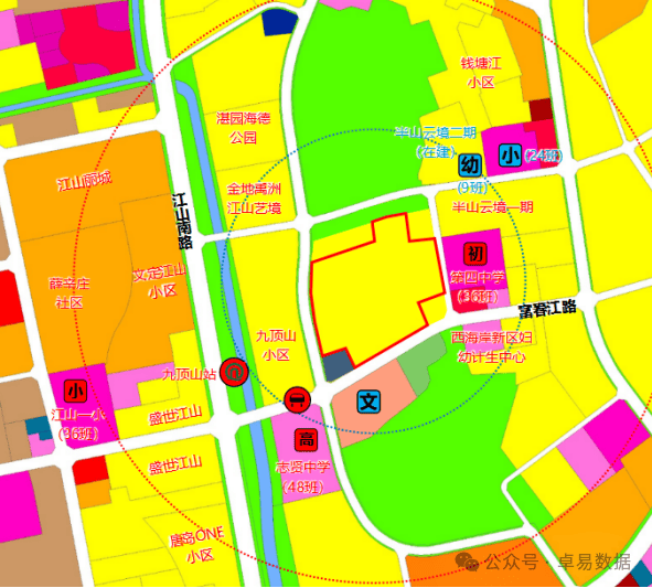 2. 教育与医疗:周边现状有江山一小(36 班),开发区第四中学(36 班),开发区第一中学,西海岸新区妇幼计生中心;规划有 9 班幼儿园、24 班小学。