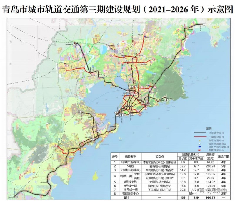 根据批复,未来五年内,青岛将建设2号线二期、5号线、6号线二期、7号线二期、8号线支线、9号线一期和15号线一期,共7个项目,线路规模139公里。至此,青岛轨道交通获批里程达503公里,位列全国第9位,对青岛落实国家战略部署,支持城市重点区域发展,完善轨道交通网络布局,提升城市公共交通服务水平等都具有重大意义。