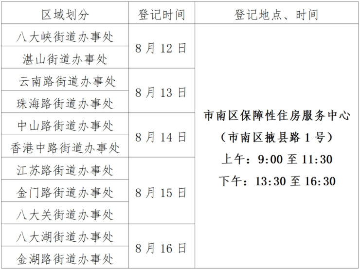 2、为避免人员聚集,方便申请人登记,保障现场登记秩序,本次以街道办事处为单位分时间段进行,可登记时间为开放登记日的9:00至11:30(上午),13:30至16:30(下午)(具体开放登记日参见下表)。