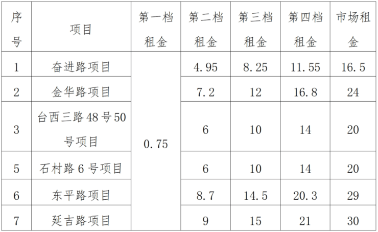 本次公共租赁住房配租房源,市场租金标准按照届时青岛市物价主管部门的标准为准。根据《关于调整公共租赁住房申请条件和保障标准等有关问题的通知》(青建房字〔2020〕19号)、《关于调整公共租赁住房实物配租第一档租金标准有关问题的通知》(青建房字〔2021〕2号)等文件规定,配租家庭按照收入情况实施差别化租金标准。各项目房屋租金标准如下(元/㎡*月):