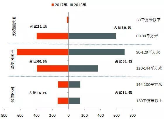 2017年,青岛迎来改善、刚改大潮,置业90-144㎡的中高面积段占比达到60.5%,甚至144㎡以上的高面积段占比也达到15.4%,两者较2016年有所上升。但60-90㎡的中低面积段却较2016年下降。