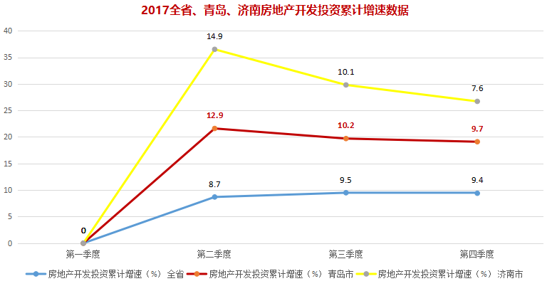 2017年,青岛房地产开发投资累计增速维持在10%以内,第二季度为8.7%,第三季度为9.5%,第四季度为9.4%。