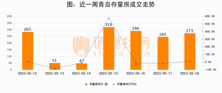 从存量房来看,2023年05月18日青岛存量房单日成交273套,比昨日增加28套,环比上涨11.4%。从近一周存量房成交来看,青岛存量房日均成交套数为215套,05月18日单日成交273套,高于近一周平均水平27%。