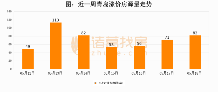 根据诸葛找房数据显示,青岛24小时涨价房源量为82套,较05月17日增加11套,环比上涨15.5%。与此同时,涨价房源占比小幅扩大,业主信心有所提升。