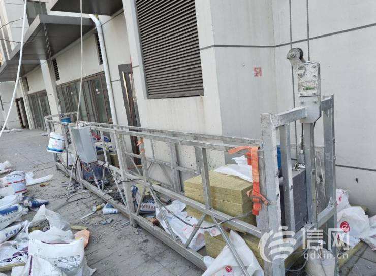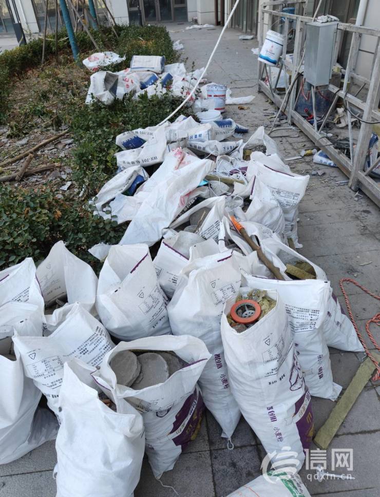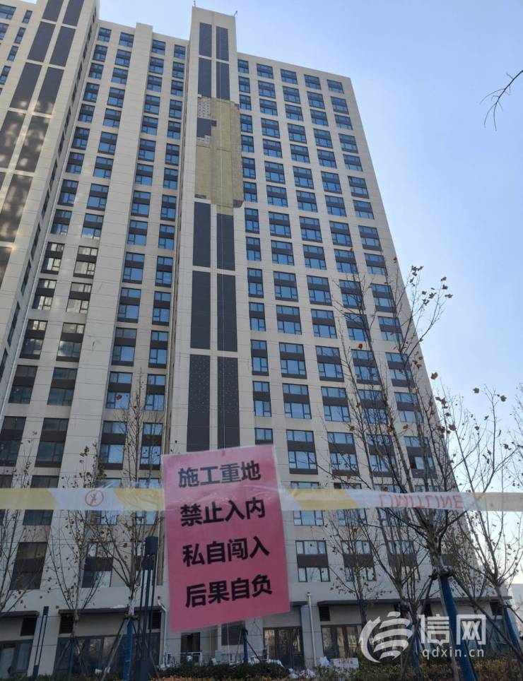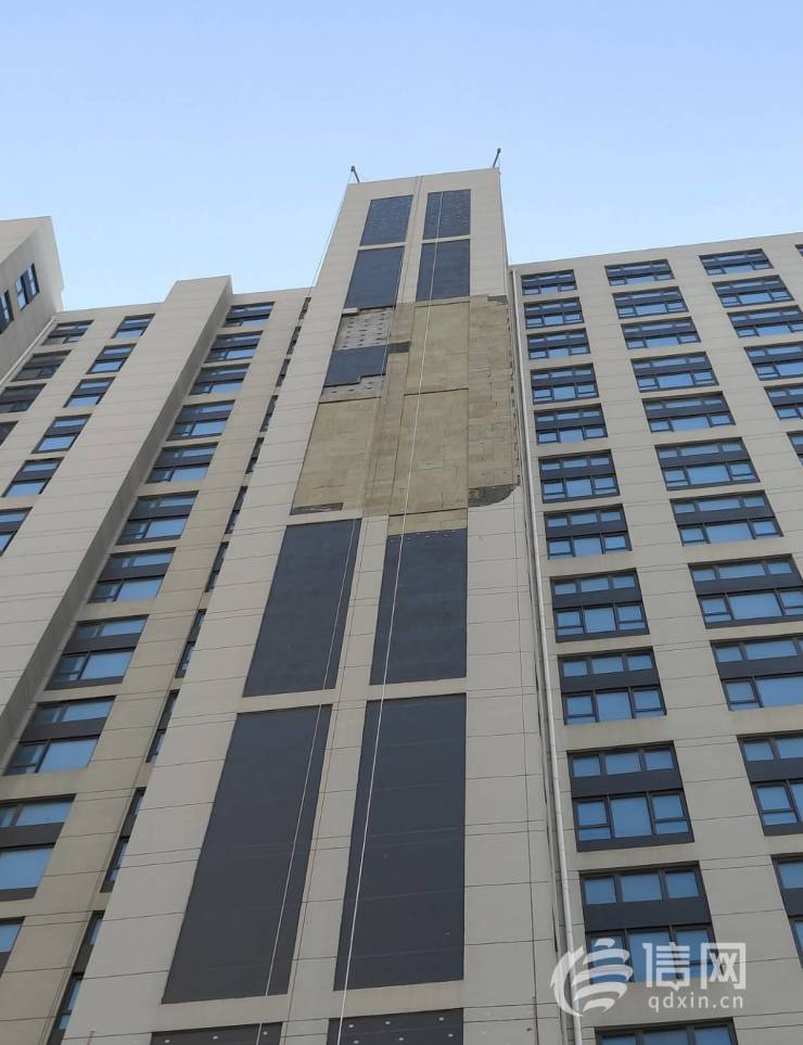 据了解,融创澜山壹号小区建成于2021年,位于城阳区靖城路885号,由青岛荣悦置业有限公司开发建设。发生墙皮脱落现象的17号楼为商住两用的公寓楼,目前尚未竣工交付。12月6日,信网来到现场发现,墙皮脱落位置位于17号楼外墙北侧,现场已拉起警戒线,提醒过往人员注意避让。从远处望去墙壁原有墙皮已经大面积脱落,从上至下均存在大块脱落点,露出内部灰黄的底色。现场有大量的装满墙体残块的编织袋尚未清运,但地上仍散落着部分破碎的外墙材料,现场有一辆用于维修的吊篮和岩棉、砂浆等外墙修复材料。