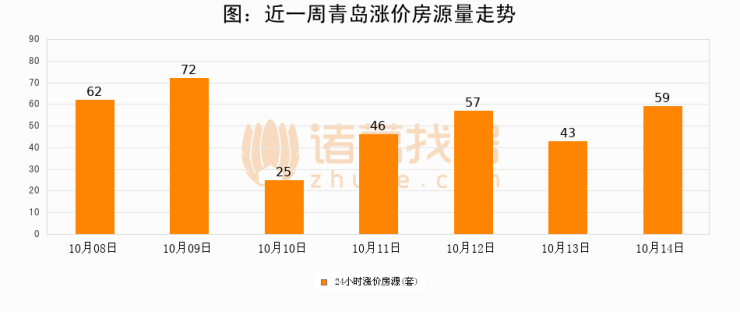 根据诸葛找房数据显示,青岛24小时涨价房源量为59套,较10月13日增加16套,环比上涨37.2%。与此同时,涨价房源占比小幅扩大,业主信心有所提升。