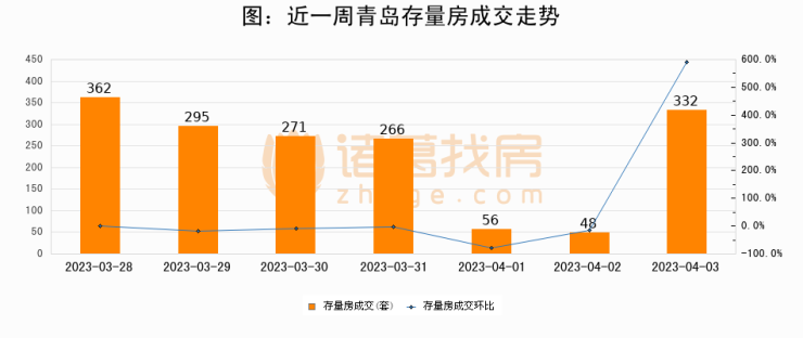 从存量房来看,2023年04月03日青岛存量房单日成交332套,比昨日增加284套,环比上涨591.7%。从近一周存量房成交来看,青岛存量房日均成交套数为232套,04月03日单日成交332套,高于近一周平均水平43.1%。