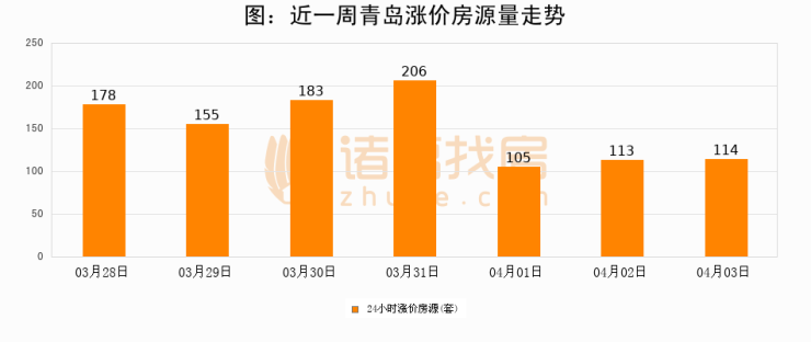 根据诸葛找房数据显示,青岛24小时涨价房源量为114套,较04月02日增加1套,环比上涨0.9%。与此同时,涨价房源占比小幅扩大,业主信心有所提升。