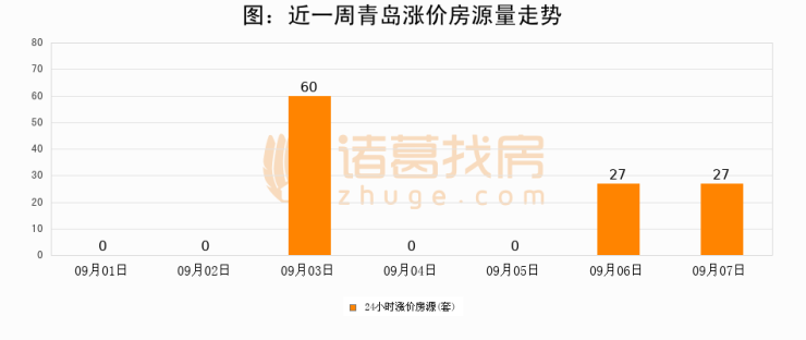 根据诸葛找房数据显示,青岛24小时涨价房源量为27套,较09月06日持平。