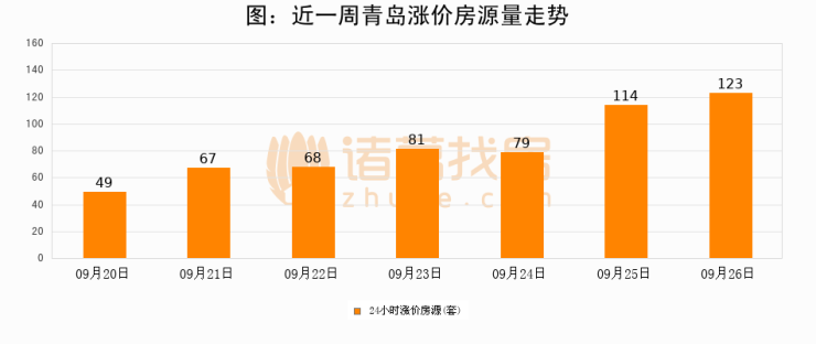 根据诸葛找房数据显示,青岛24小时涨价房源量为123套,较09月25日增加9套,环比上涨7.9%。与此同时,涨价房源占比小幅扩大,业主信心有所提升。