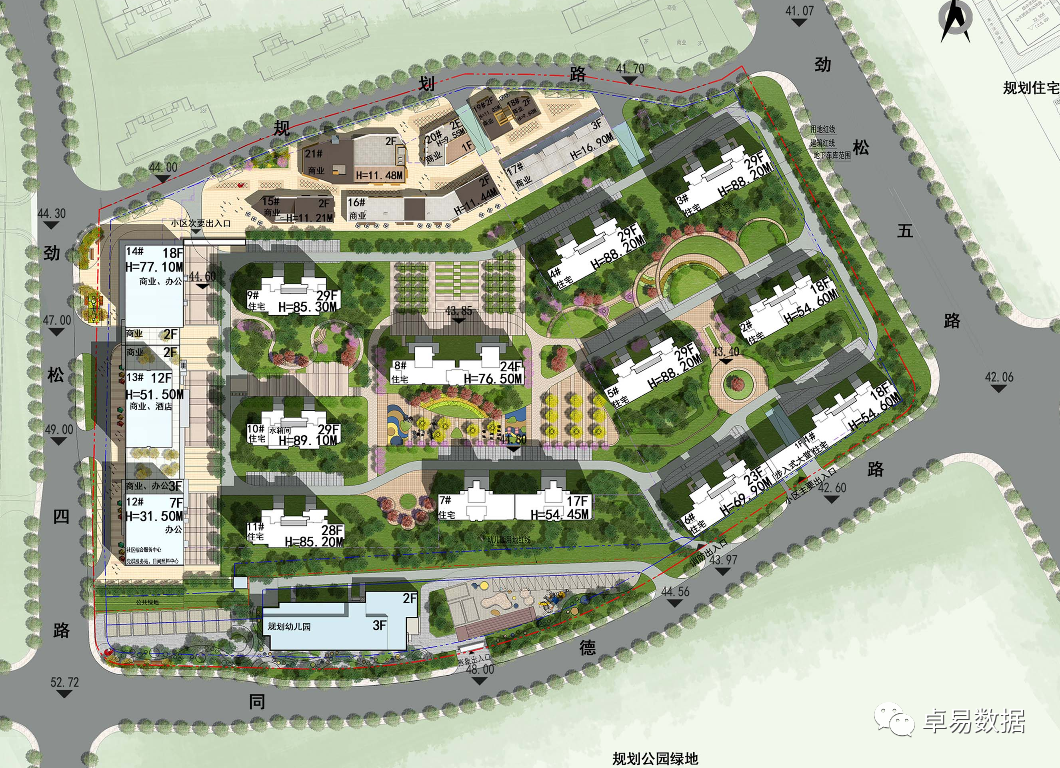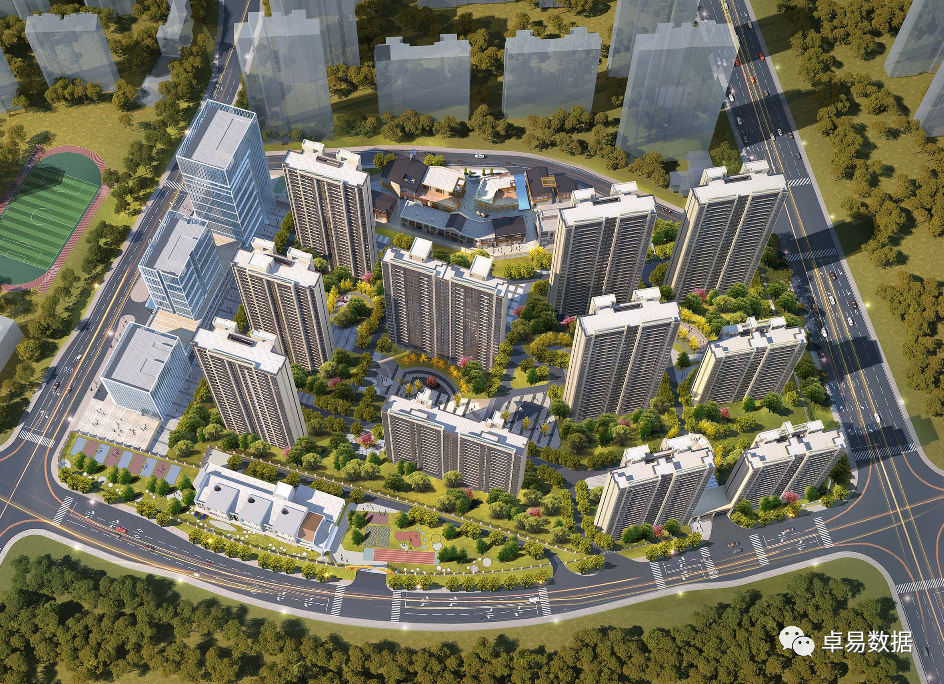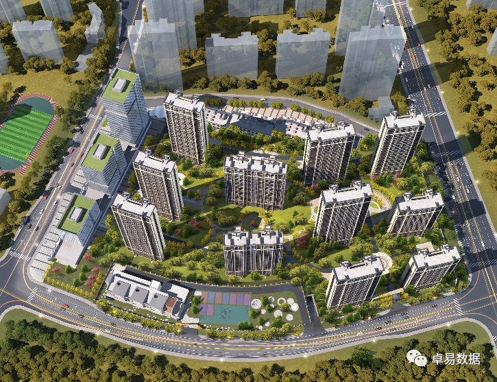 根据2021年的规划版本:规划总建面257023㎡,计容建面185643㎡(住宅148512㎡,商务商务37128㎡),根据规划方案共建设15栋楼及配套,其中11栋住宅(6栋29F+2栋18F+1栋16F+1栋17F+1栋23F)+3栋商业办公+3F商业。