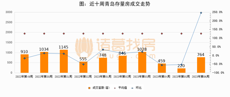 存量房方面,第06周青岛存量房成交764套,较上周增加544套,环比上涨247.3%。从近十周成交走势来看,周均成交套数为770套,本周低于平均水平0.8%。