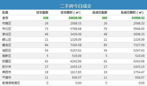 13日全市二手房成交393套,总成交面积34506.32㎡,包括住宅386套,成交面积33926.99㎡。(图为各区市住宅交易量数据)
