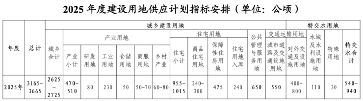 北京2025年度建设用地供应计划(以下简称“供地计划”)坚持落实首都城市战略定位,保持各地类总量稳定,优化各类要素空间结构布局,保障优势地区高质量发展。安排建设用地供应总量3165-3665公顷,分列城乡建设用地和特交水用地。其中,城乡建设用地安排2625-2725公顷;特交水用地安排540-940公顷。