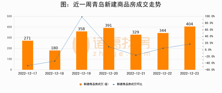 根据青岛市住房和城乡建设局数据显示,2022年12月23日青岛新建商品房成交404套,较昨日增加60套,环比上涨17.4%