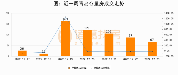从存量房来看,2022年12月23日青岛存量房单日成交67套,比昨日减少20套,环比下降23%。从近一周存量房成交来看,青岛存量房日均成交套数为83套,其中12月19日成交量最高为163套,12月23日单日成交67套,低于近一周平均水平19.3%。