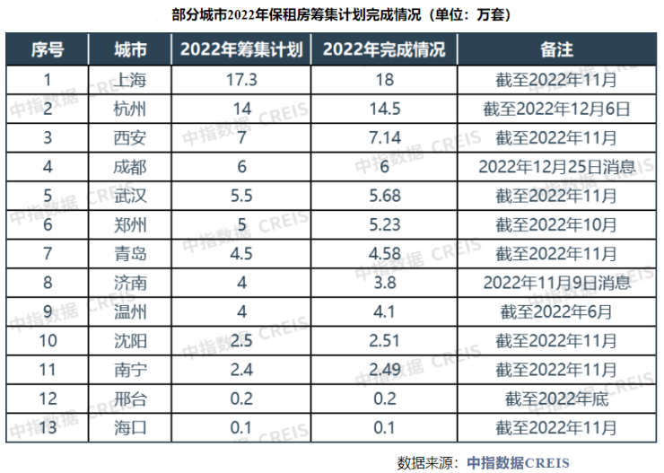 住建部统计数据显示,2022年1-10月,全国保租房已开工建设和筹集233.6万套,占年度计划的98.8%,多省市已提前或超额完成2022年预定目标。