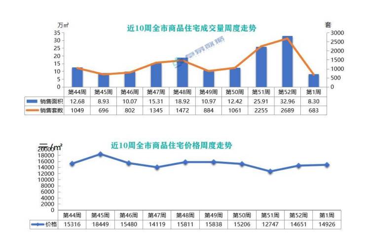根据卓易数据统计,上周(1.1-1.7)青岛新建商品住宅成交683套,环比下降74.6%;成交面积为8.30万㎡,环比下降74.82%。
