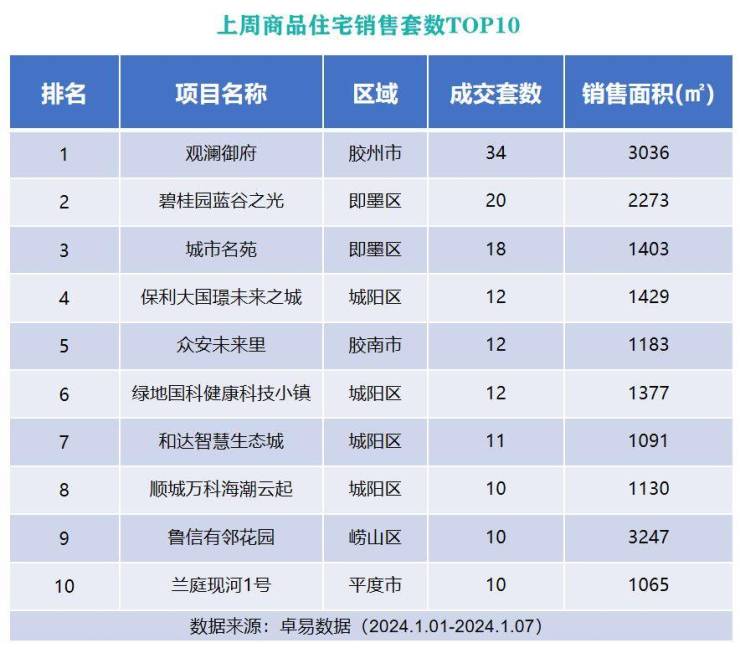 从各项目成交套数来看,位于胶州市的观澜御府以成交34套的成绩列榜单首位;位于即墨区的碧桂园蓝谷之光以成交20套成绩上榜第二位;位于即墨区的城市名苑以成交18套的成绩列榜单第三位。