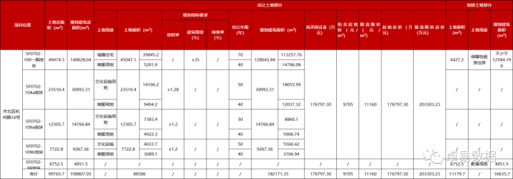 SF0702-100一期地块为商住混合用地,用地面积4.945万平方米、规划建筑面积14.06万平方米;SF0702-104a地块为商业商务文化混合用地、规划占地面积2.35万平方米、规划建筑面积3.01万平方米;SF0702-109a地块为商业商务文化混合用地,用地面积1.23公顷,规划建筑面积1.48万平方米;SF0702-109b地块为商业商务文化混合用地,用地面积0.77公顷,规划建筑面积0.93万平方米。SF0702-99地块为服务设施用地(划拨9班幼儿园),用地面积0.68万平方米,规划建筑面积0.41万平方米;