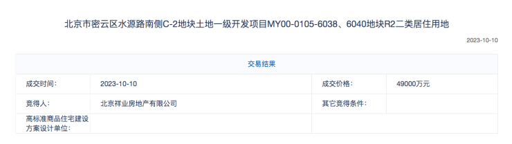 根据成交结果,该地块由北京住总集团旗下北京祥业房地产有限公司以底价4.9亿元摘得。