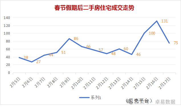根据卓易数据统计,春节假期后,全是范围内成交的二手房也开始活跃,例如昨天(2月17日)一天的二手房住宅网签量为240套。