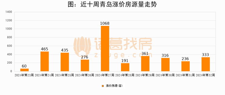 从调价房源来看,第32周青岛涨价房源333套,较上周上涨41.1%。与此同时,32周涨价房源占比回落1.71个百分点,业主信心小幅波动,购房者可则需入市。
