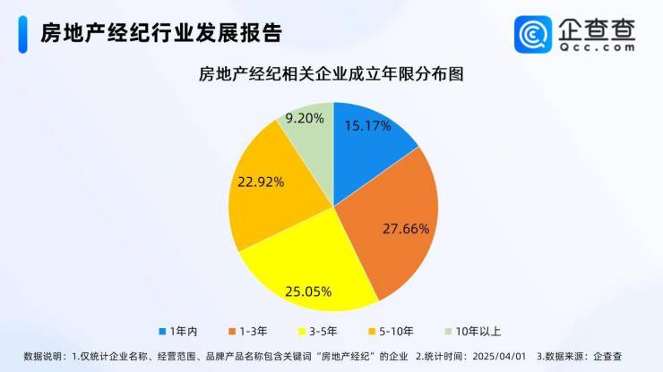 企查查数据显示,从成立年限来看,现存房地产经纪相关企业的成立年限多在1-3年,占比27.66%。其次,成立年限在3-5年的相关企业占比25.05%。成立年限在10年以上的相关企业占比9.20%。(信网记者)
