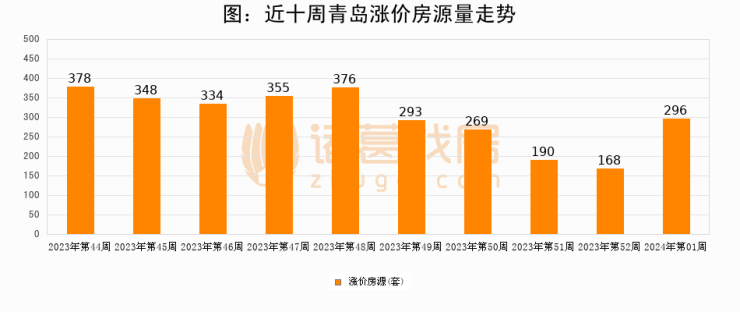 从调价房源来看,第52周青岛涨价房源296套,较上周上涨76.2%。与此同时,52周涨价房源占比提升0.71个百分点,业主信心持续恢复。