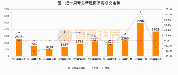 进入2024年第52周(12月25日-12月31日),青岛新建商品房成交3708套,较上周减少1288套,环比下降25.8%