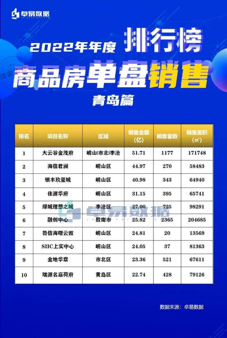 以下是2022年全年青岛房地产TOP20具体销售情况以及单盘销售情况。