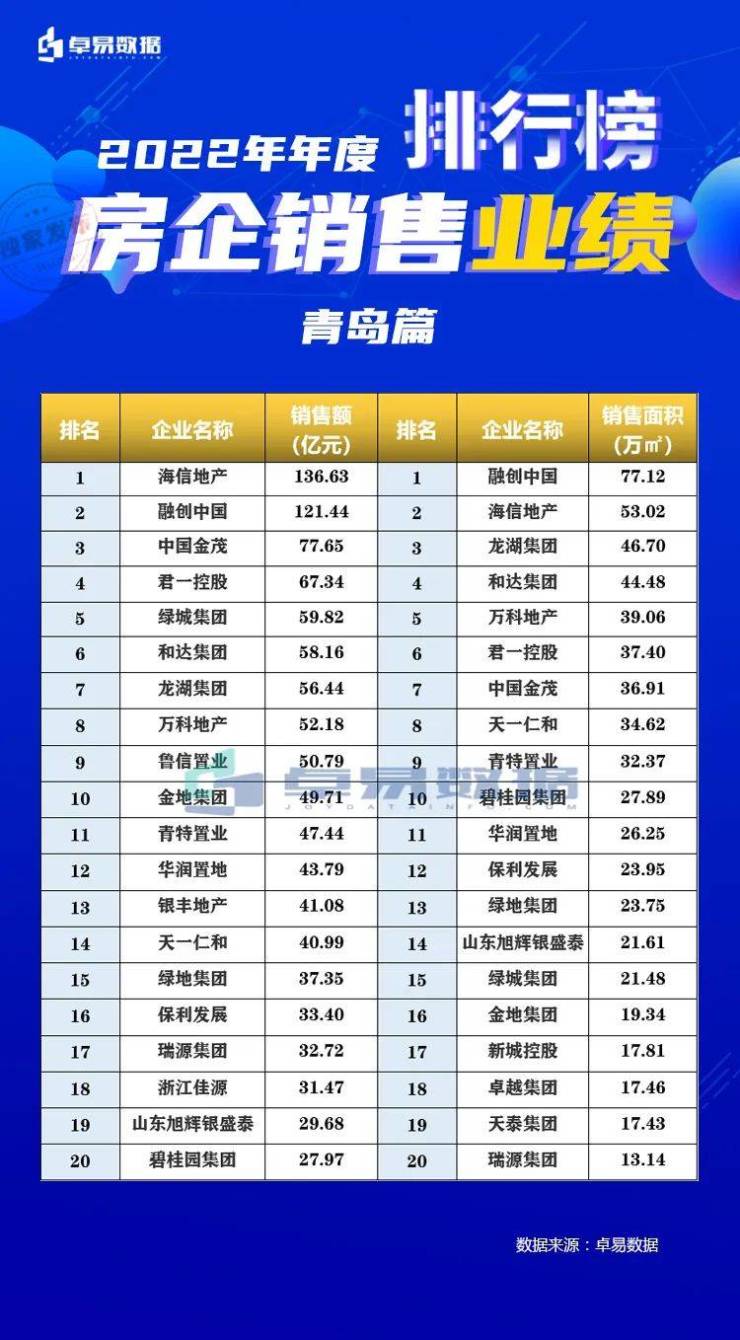 2022年青岛房企年度TOP20 全年卖出12万套