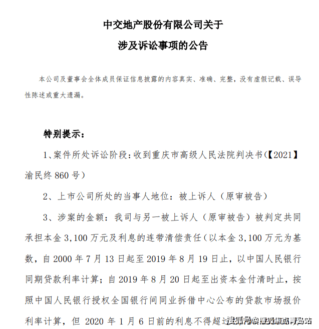 5月9日(昨天),中交地产股份有限公司发布公告称,中国信达就以股东损害公司债权人利益责任纠纷为由提起上诉,中交地产及另一合作方需承担3100万元及利息的连带清偿责任。