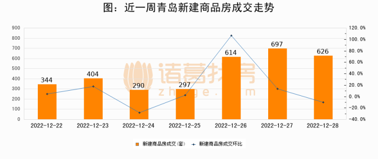 根据青岛市住房和城乡建设局数据显示,2022年12月28日青岛新建商品房成交626套,较昨日减少71套,环比下降10.2%