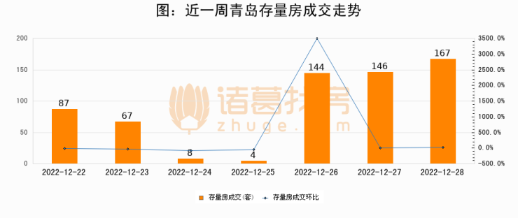 从存量房来看,2022年12月28日青岛存量房单日成交167套,比昨日增加21套,环比上涨14.4%。从近一周存量房成交来看,青岛存量房日均成交套数为89套,其中12月28日成交量最高为167套,12月28日单日成交167套,高于近一周平均水平87.6%。