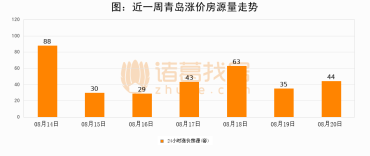 根据诸葛找房数据显示,青岛24小时涨价房源量为44套,较08月19日增加9套,环比上涨25.7%。与此同时,涨价房源占比小幅扩大,业主信心有所提升。
