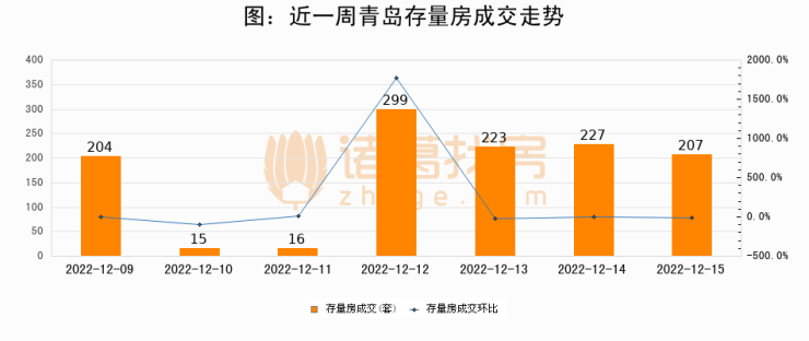 从存量房来看,2022年12月15日青岛存量房单日成交207套,比昨日减少20套,环比下降8.8%。从近一周存量房成交来看,青岛存量房日均成交套数为170套,其中12月12日成交量最高为299套,12月15日单日成交207套,高于近一周平均水平21.8%。