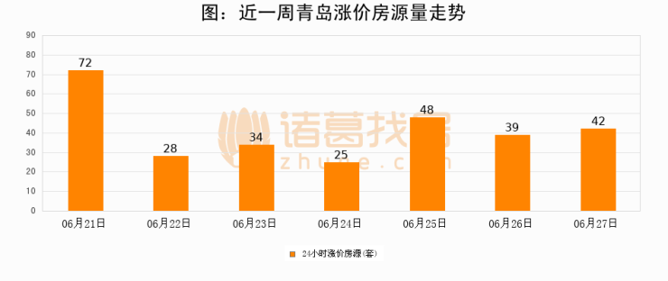 根据诸葛找房数据显示,青岛24小时涨价房源量为42套,较06月26日增加3套,环比上涨7.7%。与此同时,涨价房源占比小幅扩大,业主信心有所提升。