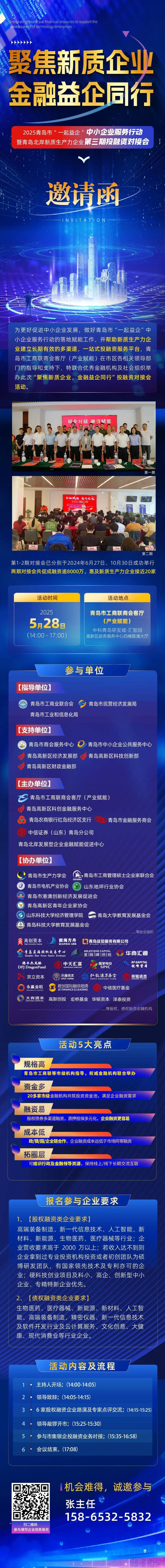 青岛市工商联商会客厅(产业赋能)在市区各相关领导部门的指导和支持下,特联合优秀金融机构及社会组织举办此次“聚焦新质企业,金融益企同行”投融资对接会活动。