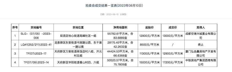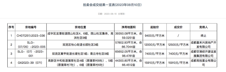 双流区2宗地块均以低溢价成交,分别被成都嘉禾兴房地产开发有限公司和成都空港兴城置业有限公司竞得,溢价率分别为4.17%和0.78%。余下的龙泉驿区(2宗)、双流区(1宗)、温江区(1宗)、高新区(1宗)均被本地国企托底拿下。