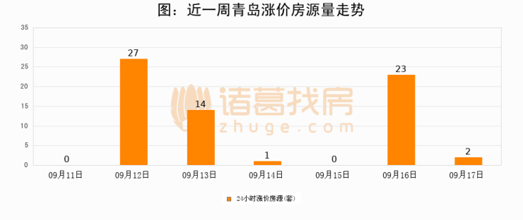 根据诸葛找房数据显示,青岛24小时涨价房源量为2套,较09月16日减少21套,环比下降91.3%。与此同时,涨价房源占比小幅回落,对于购房者来说是一个入市窗口期,购房者可抓住时机入市。