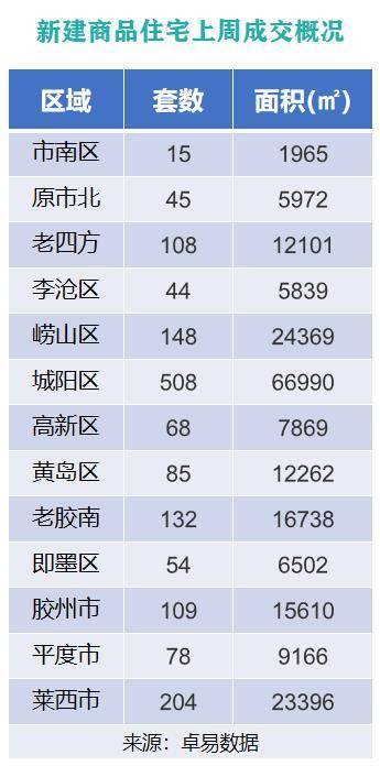 从各区成交情况来看,上周城阳区新建商品住宅以成交面积66990㎡的成绩,位列上周各片区新建商品住宅成交面积榜首位;崂山区以成交面积24369㎡的成绩,位列成交面积榜第二位;莱西市以成交面积23396㎡的成绩,位列成交面积榜第三位。