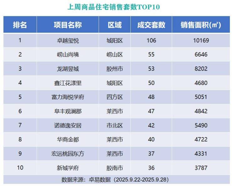 从各项目成交套数来看,位于城阳区的卓越玺悦以成交106套的成绩列榜单首位;位于崂山区的崂山尚境以成交55套成绩上榜第二位;位于胶州市的龙湖昱城以成交53套的成绩列榜单第三位。