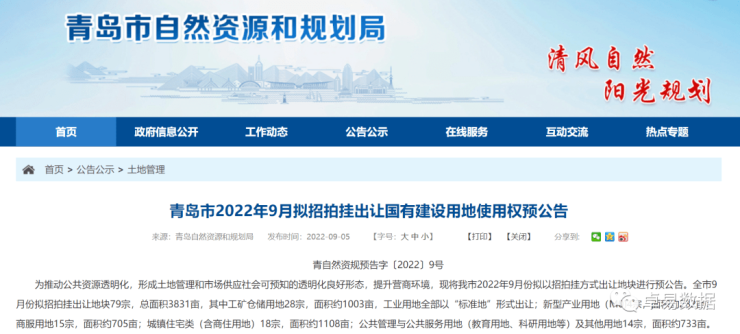 青岛市2022年9月份拟以招拍挂方式出让地块进行预公告。