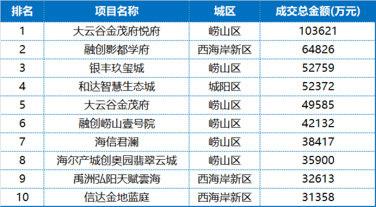 成交金额方面,6月大云谷金茂府悦府以约10.36亿元成交额居首,其次为融创影都学府成交6.5亿元,银丰玖玺城约5.3亿元排名第三位。崂山区上榜楼盘单价高,均为高端改善定位。