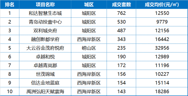 6月新房成交套数排在前10位的楼盘集中分布在城阳区和西海岸新区,主城崂山区仅有1盘。其中,位于城阳区的和达智慧生态城项目位居榜首,项目地处夏庄板块,享有独特的山水生态优势,北边即是白沙河运动公园,项目体量大,小高层、洋房、别墅、商铺都有,房源充足可选择性大,目前单价12550元/平方米,在售建面88/117/138平方米三居,户型设计符合目前市场主流需求。