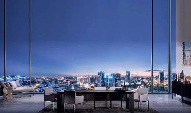 而为了实现居住极致的观景体验,黑卓·天筑采用全玻璃幕墙、全景落地窗设计,这要求玻璃选材又上一个台阶。断桥铝合金的三玻两腔LOW-E玻璃,降噪、隔热、防风、防紫外线,还保持最优越的透光性。想象一下,当你站在270°落地窗前,一城繁华就在脚下,远处海天一色,日夜轮转,人间灯火与漫天星光璀璨同辉,何其浪漫。