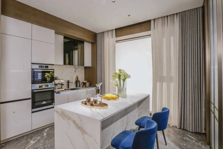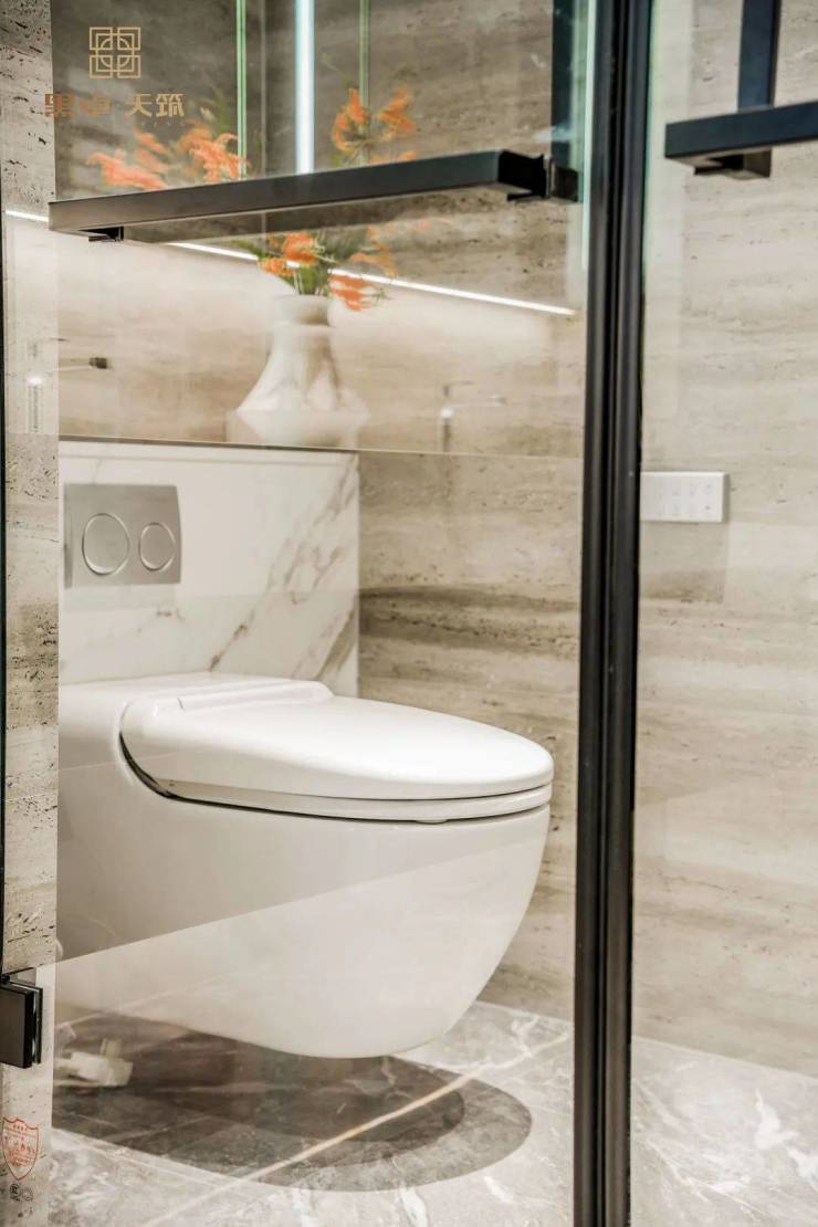 在黑卓·天筑这样的无缝化细节处理不止一处,无论是通铺的地板,还是中西厨的岛台,甚至曲线型的浴室内都随处可见。